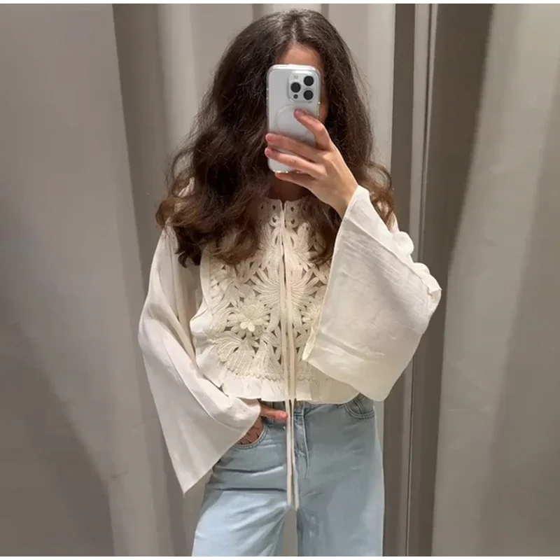 Stylish 2-Piece Set – Includes a loose, lace-up blouse with flared sleeves and a matching floral embroidered mini skirt.
