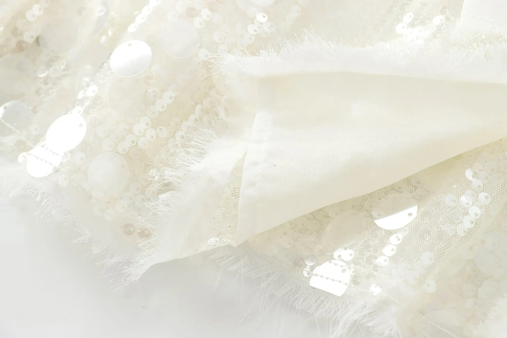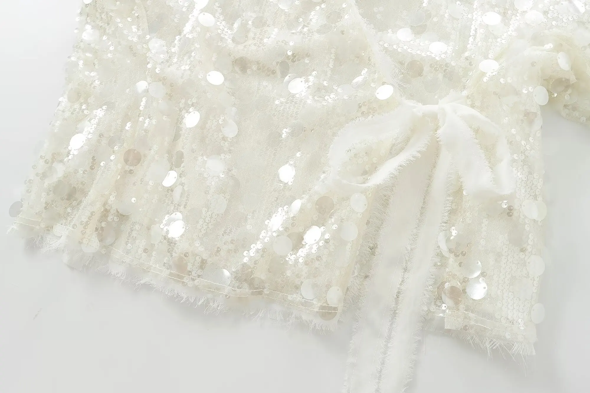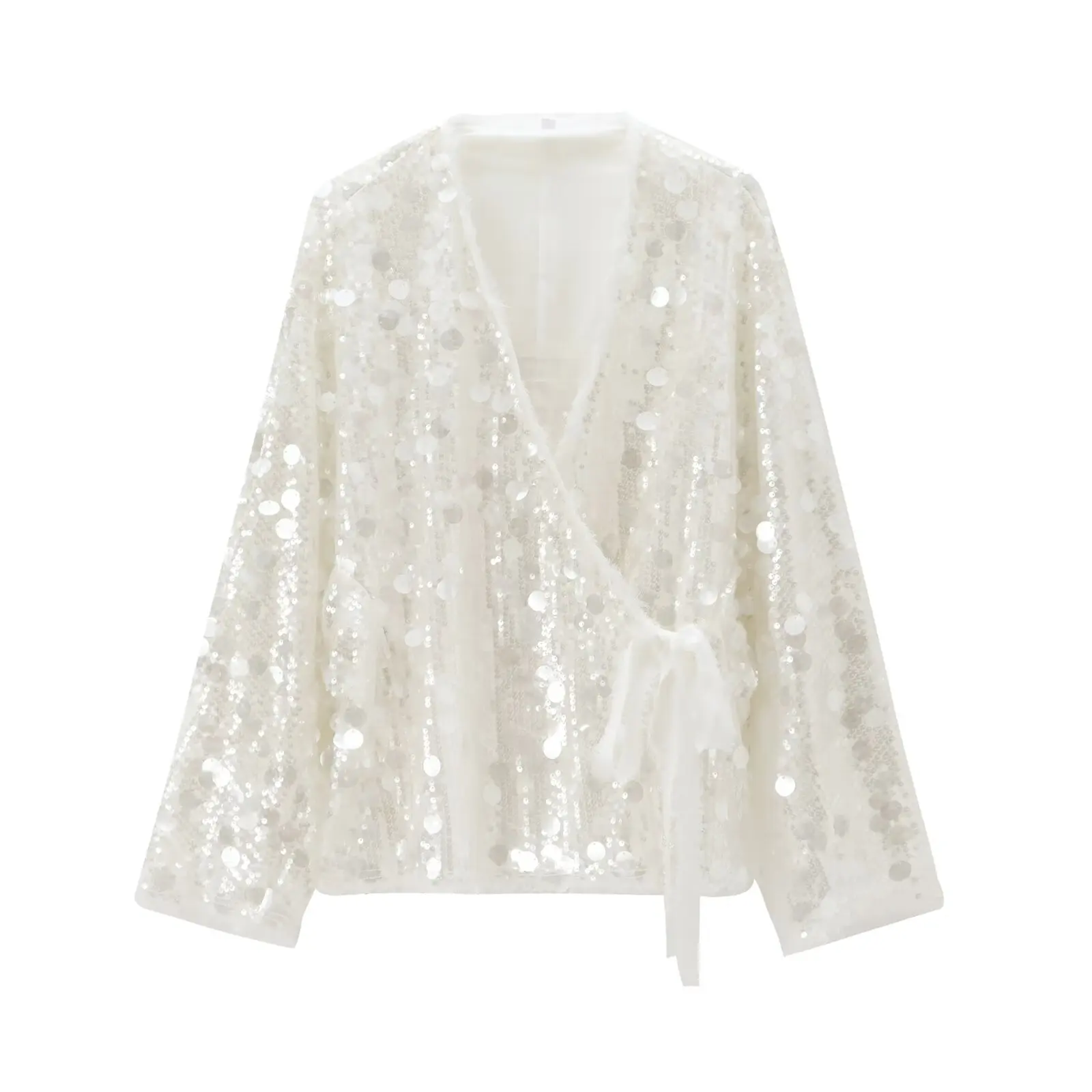 Designed with a flattering V-neck, long sleeves, and a loose kimono-style silhouette, this wrap-style outerwear sparkles with all-over sequins, making it perfect for evening outings, special occasions, or simply elevating your everyday look. Lightweight yet dramatic, it’s your go-to layer for instant chic.