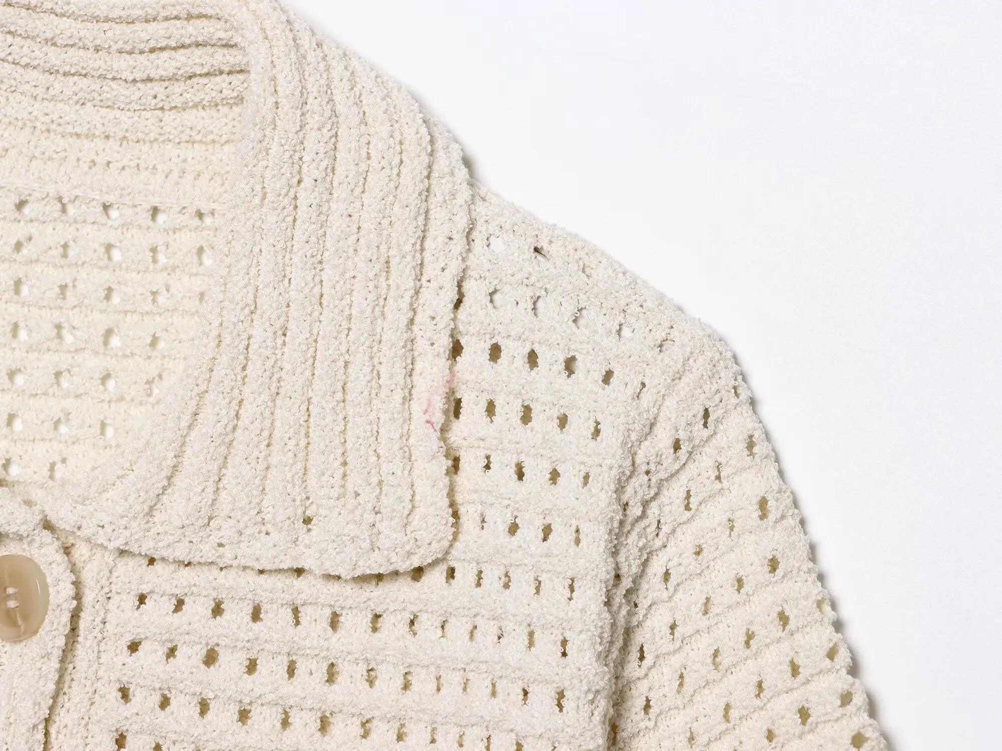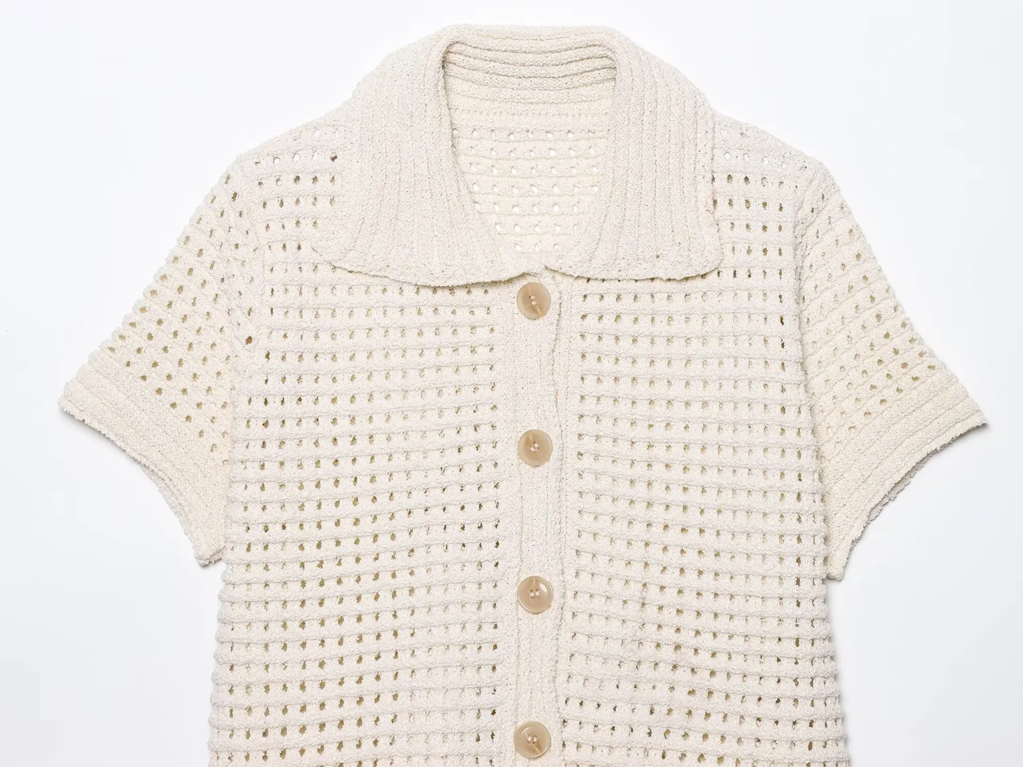 Featuring delicate hollow-out knitwork, a trendy frayed hem, and a lapel collar with front buttons, this short-sleeve jacket blends feminine charm with a touch of edge. Dress it up over a summer dress or keep it casual with denim—either way, you’ll look effortlessly put-together.