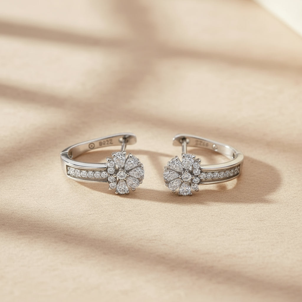 Handcrafted in 925 sterling silver, these hoop earrings feature a round zircon stone that captures light with a brilliance reminiscent of morning dew over tulip petals. Their gentle floral curves and romantic silhouette evoke the essence of femininity, while the solid 5g structure ensures perfect balance between presence and comfort.