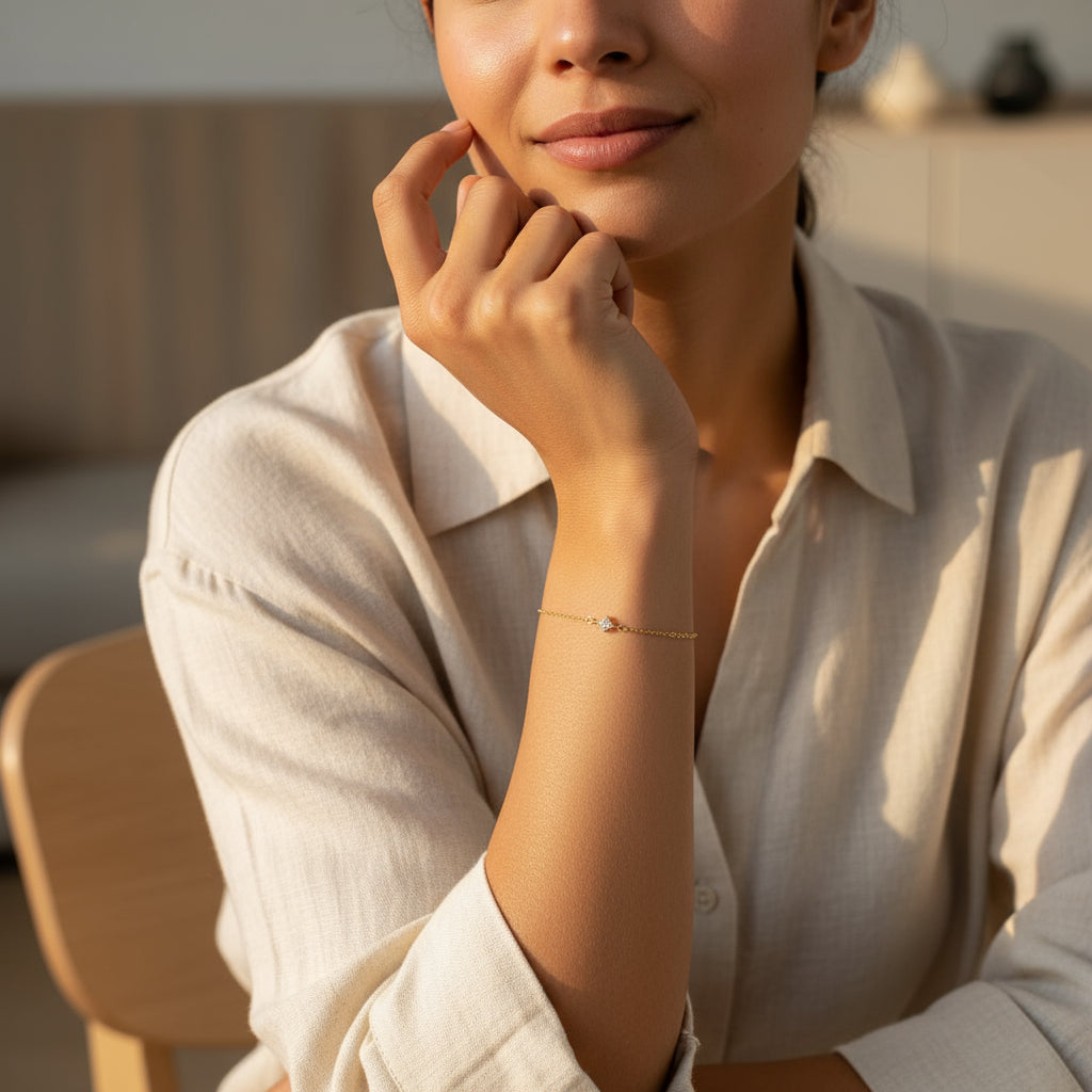 Pair with a minimalist watch or stack with slim bangles. For a Riviera mood, add petite pearls and let the solitaire be the wrist’s point of light.